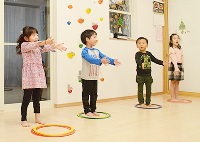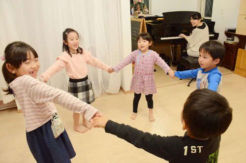 リトミックでは、良く考えて表現することが多くなり、同時に音楽的な事柄もたくさん入ってきます。リトミックの活動を通して、良くわかる感触、(手)良く見える目、良く聞こえる耳を育んでいきます。