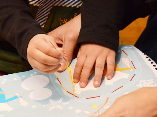 音楽の中で表現したことや、これからするであろう事柄を、自分のイメージをもてるようにするために、色ぬりをしたり、貼り絵や折り紙をお父様やお母様といっしょに楽しみます。